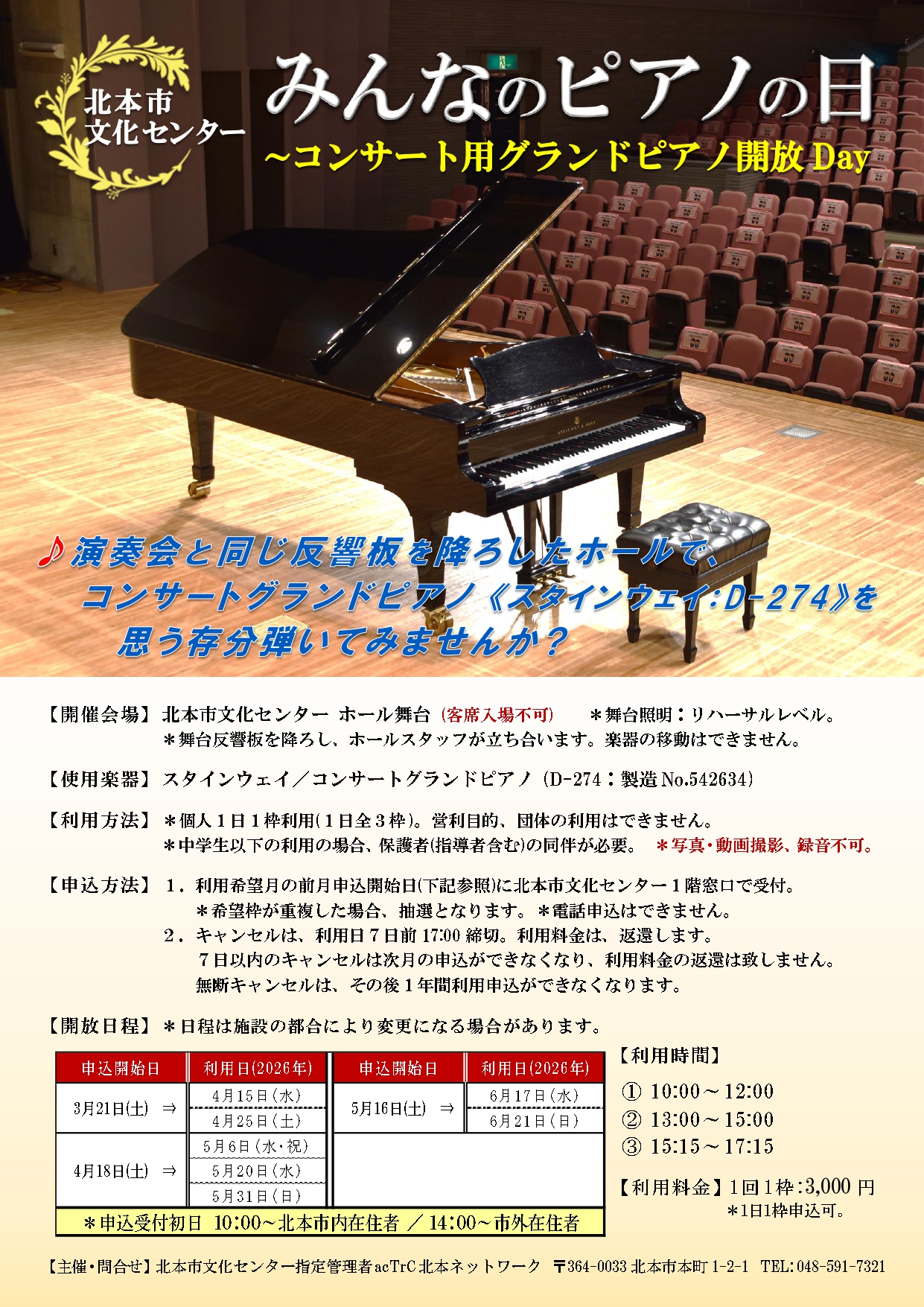 演奏会と同じ反響板を降ろしたホールで、≪スタインウェイ:D-274≫を思う存分弾いてみませんか?
