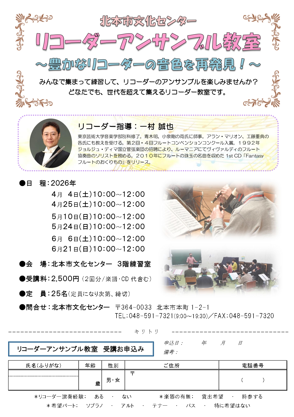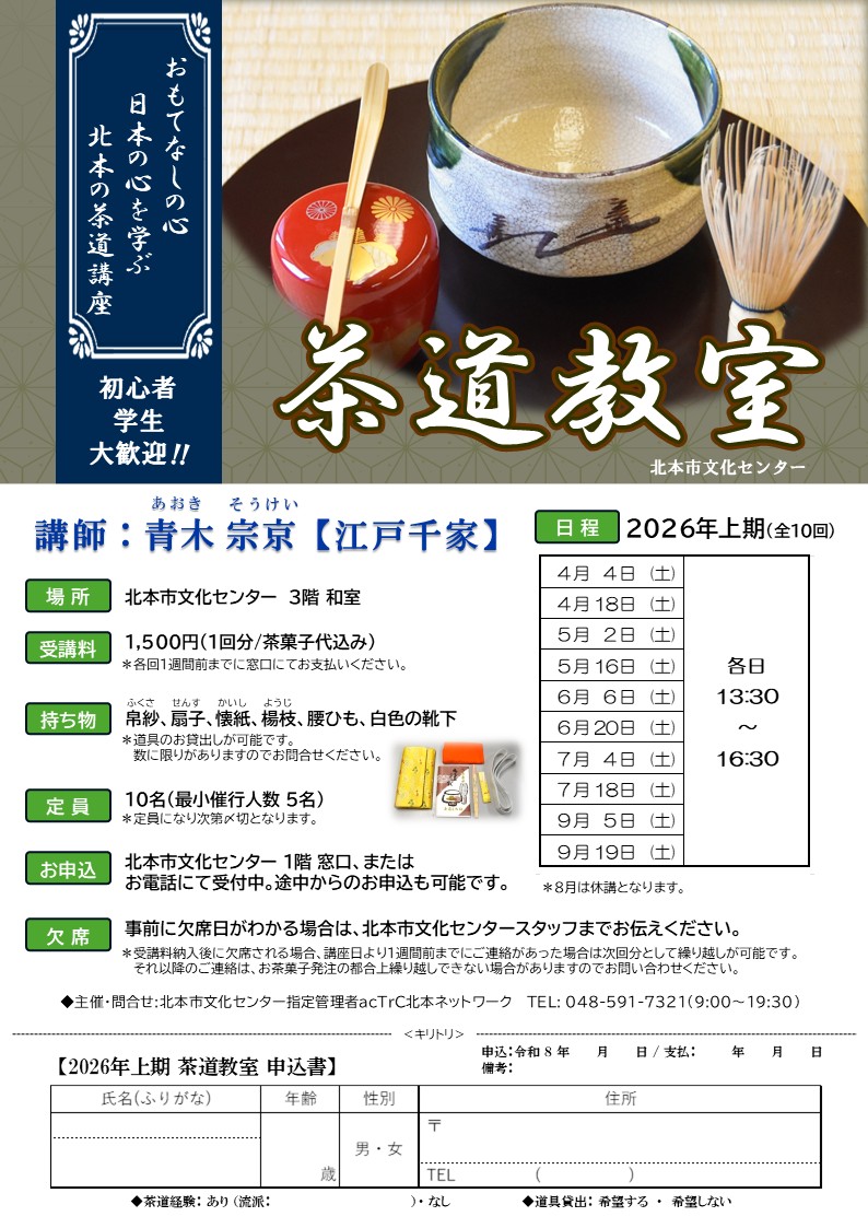 受講ご希望の方は、申込用紙に必要事項をご記入のうえ北本市文化センター窓口まで、またはお電話でも受け付けております。